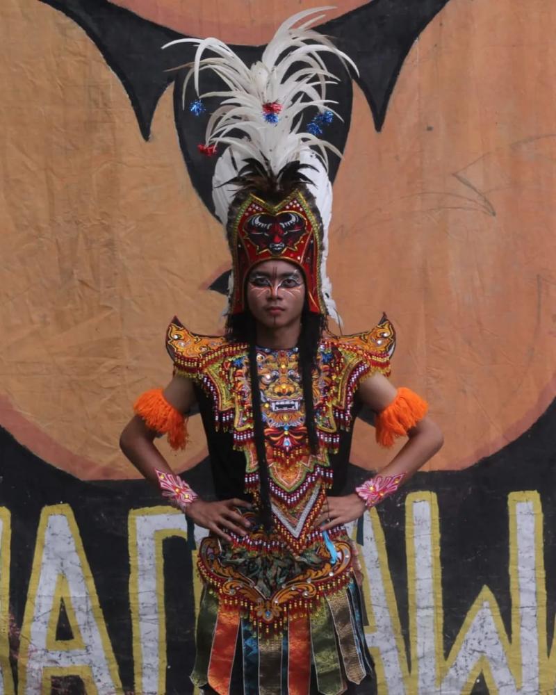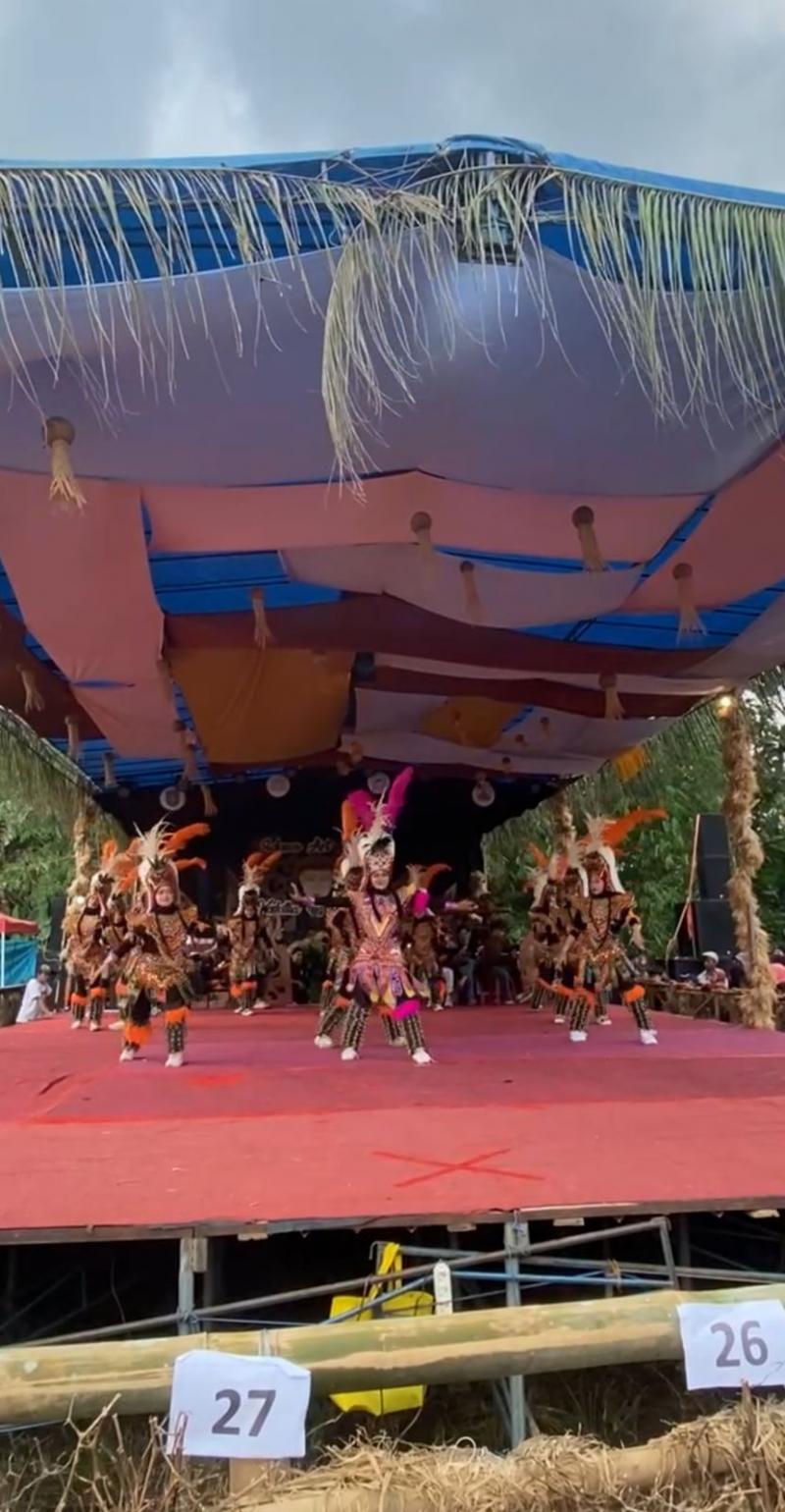 Tarian ini menggambarkan sekelompok prajurit gagah yang berkamuflase dalam melawan penjajah. Kostum warna warni, mahkota bulu khas, riasan wajah yang unik, kian menjadi daya tarik dari kesenian tersebut.